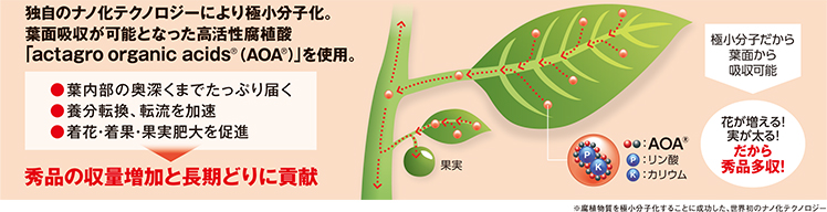 世界初の独自製法「ナノ化テクノロジー」で腐植物質を極小分子化、葉面吸収が可能となった高活性腐植酸「AOA(actagro organic acids®)」が、生殖生長、養分転換、転流を強力に促進することで、適切な着花、着果、果実肥大をもたらし、秀品期間を続けながら収量向上を目指す「秀品名人」への道を、力強くサポートいたします。
